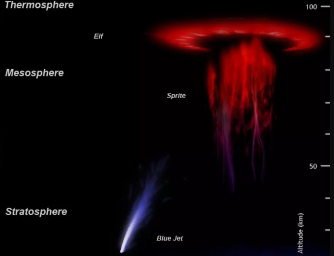 Тези червени мълнии са неразделна част от явленията в горните слоеве на атмосферата, които се наричат ​​преходни светлинни явления. Подобно на спрайтовете тези явления също имат вълшебни имена: син джет и елф. Всички те се появяват на различни височини, но общото между тях е, че са области на ярко светене в атмосферата.
